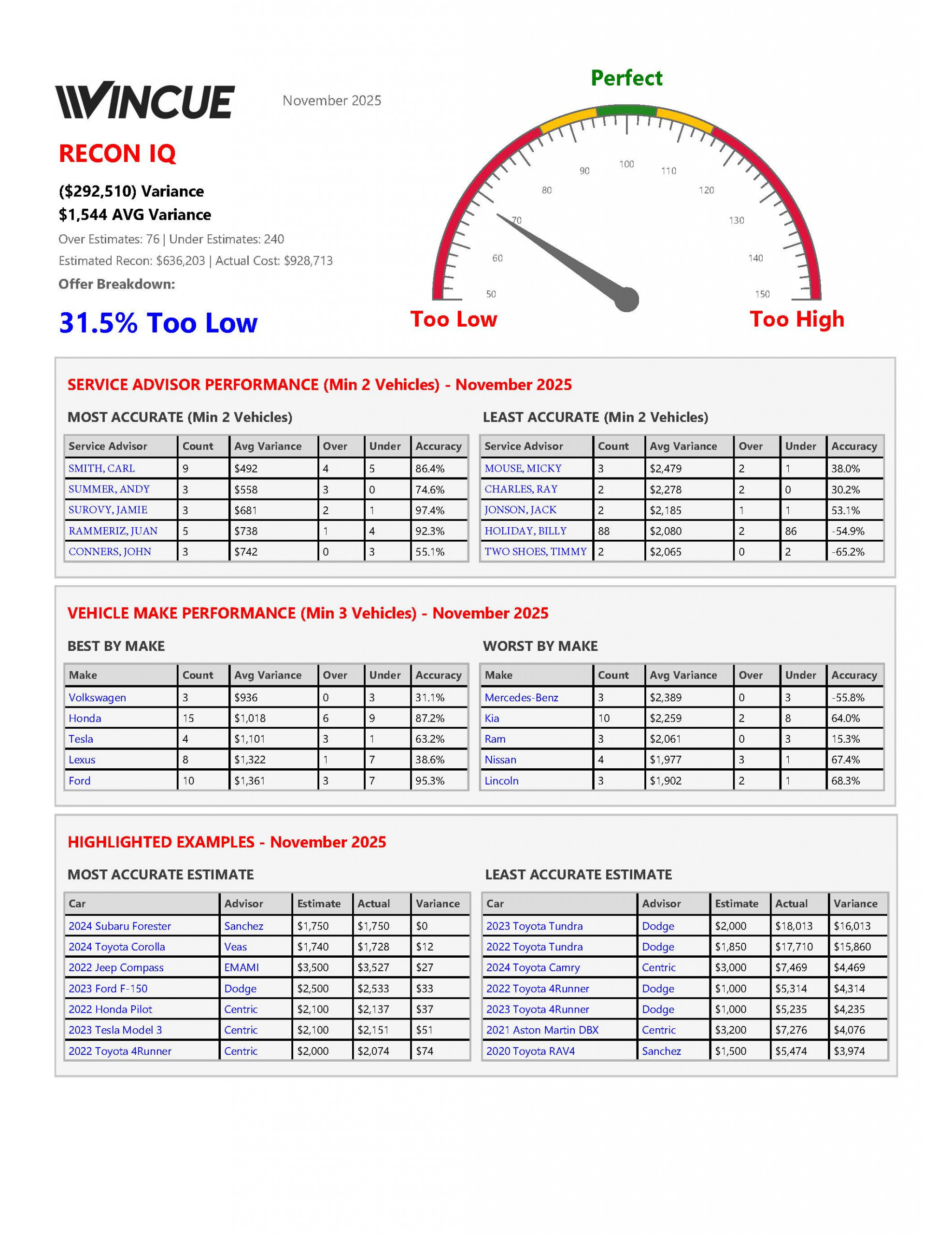 ReconIQ is the first solution built to measure reconditioning accuracy by comparing the estimated recon cost at appraisal with the actual recon cost once the vehicle is completed in service. This isn’t a snapshot or a one-time analysis. It’s continuous, VIN-level measurement—automated across your operation.